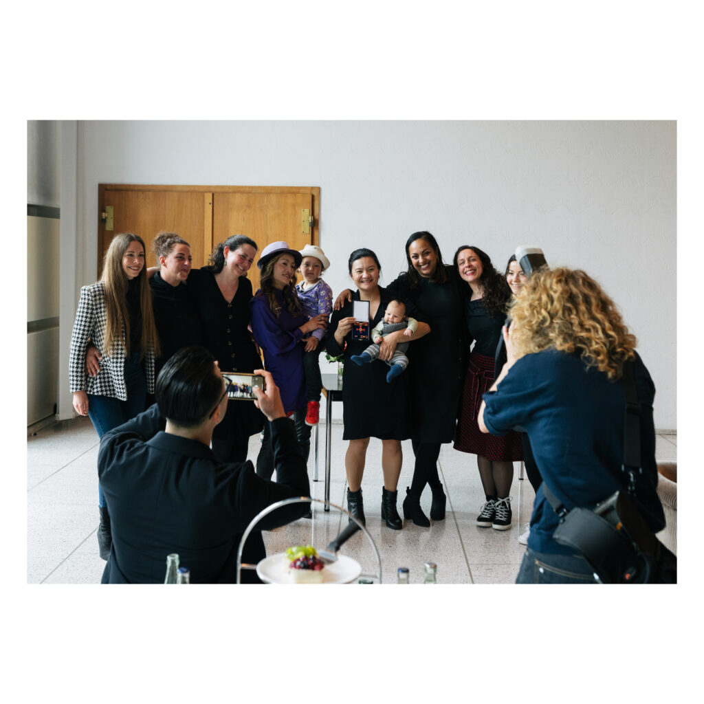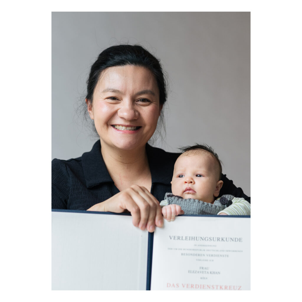 „Das Bundesverdienstkreuz am Bande der Bundesrepublik Deutschland geht an… Elizaveta Khan – aber natürlich nicht nur, sondern vor allem an die gesamte In-Haus Family und an alle Menschen, die das In-Haus zu einem Ort der Solidarität, der Liebe, der Widerständigkeit, des Empowerments und der Hoffnung machen. Danke, dass Ihr mit uns seid!“